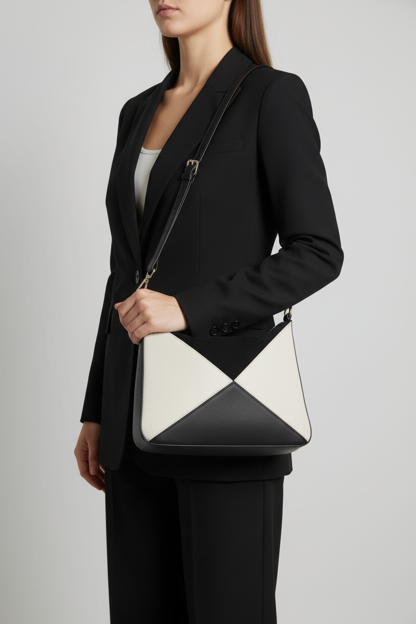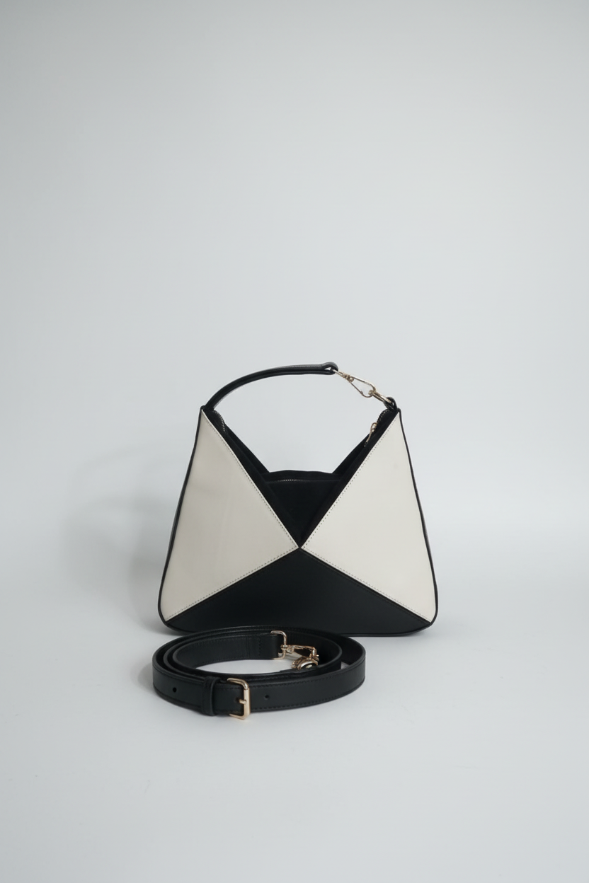 Este bolso presenta un diseño moderno y estructurado con una silueta geométrica que destaca por sus paneles triangulares en contraste.