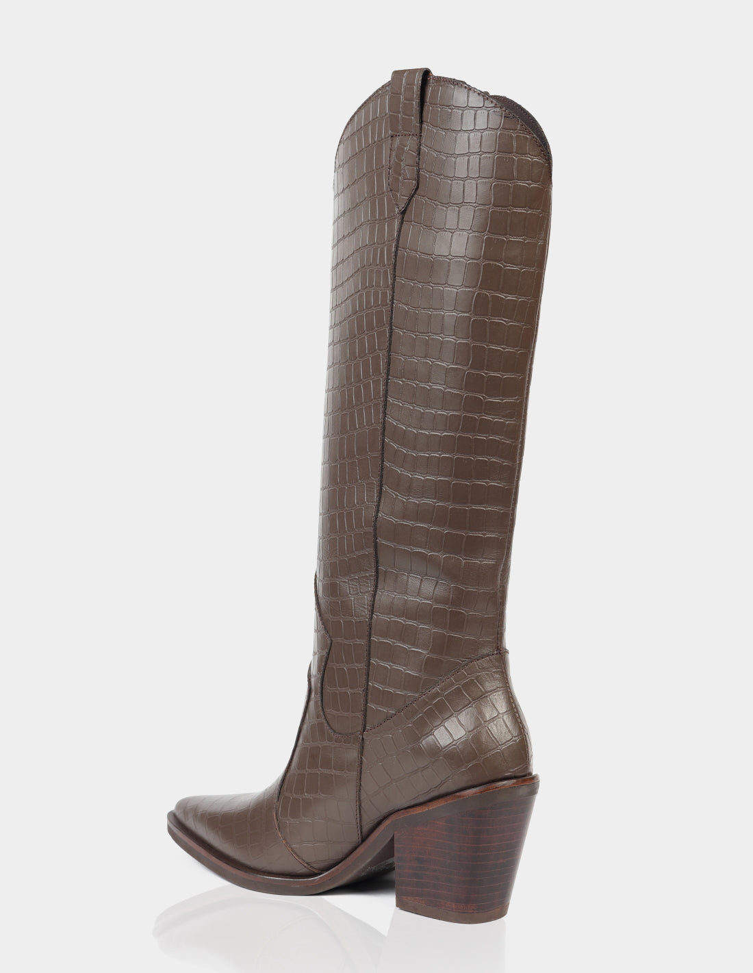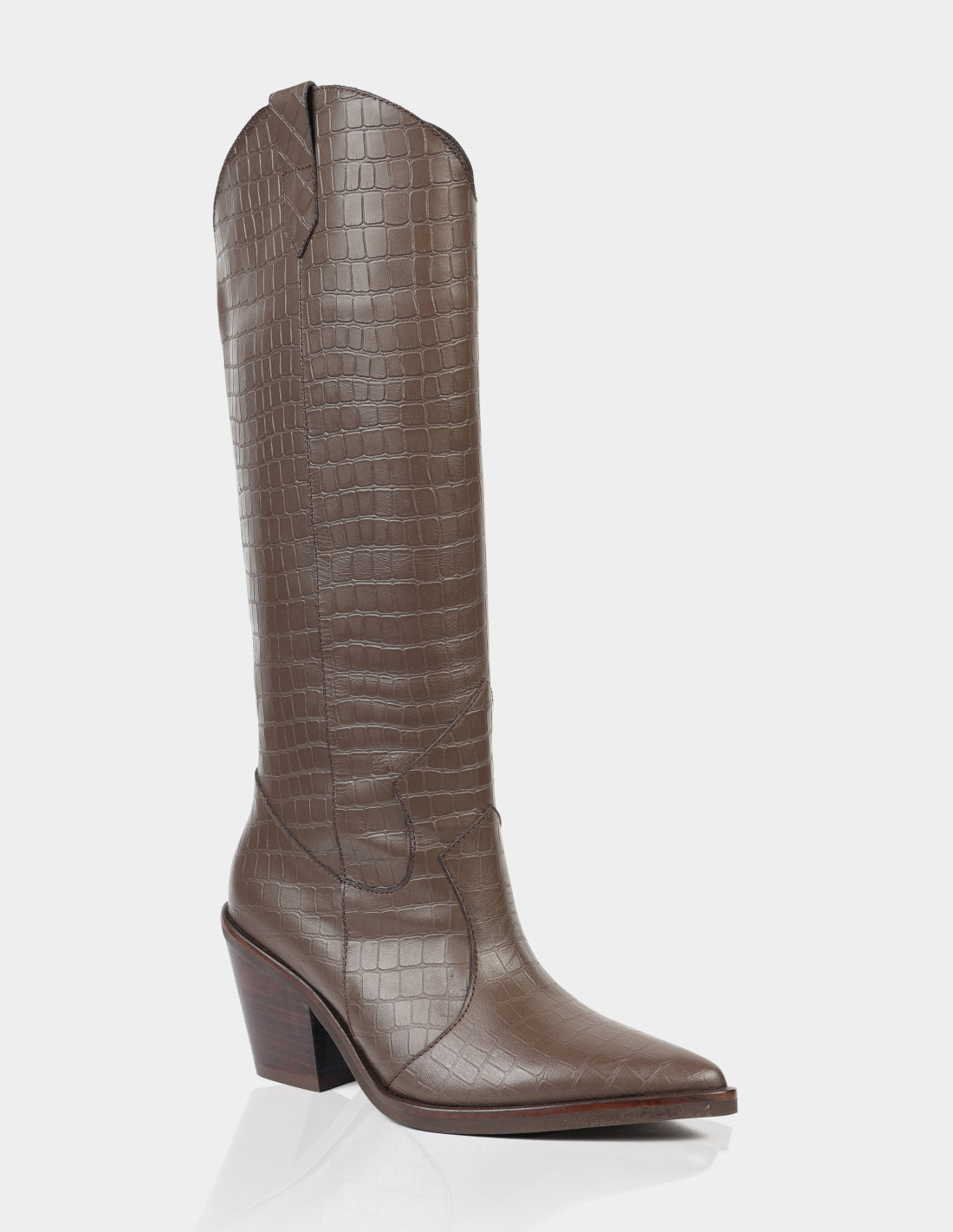 La bota CAMERON se impone con un diseño elegante y de fuerte personalidad, confeccionada en cuero con grabado reptil en color cafe, ideal para quienes buscan un calzado sofisticado con impacto visual.