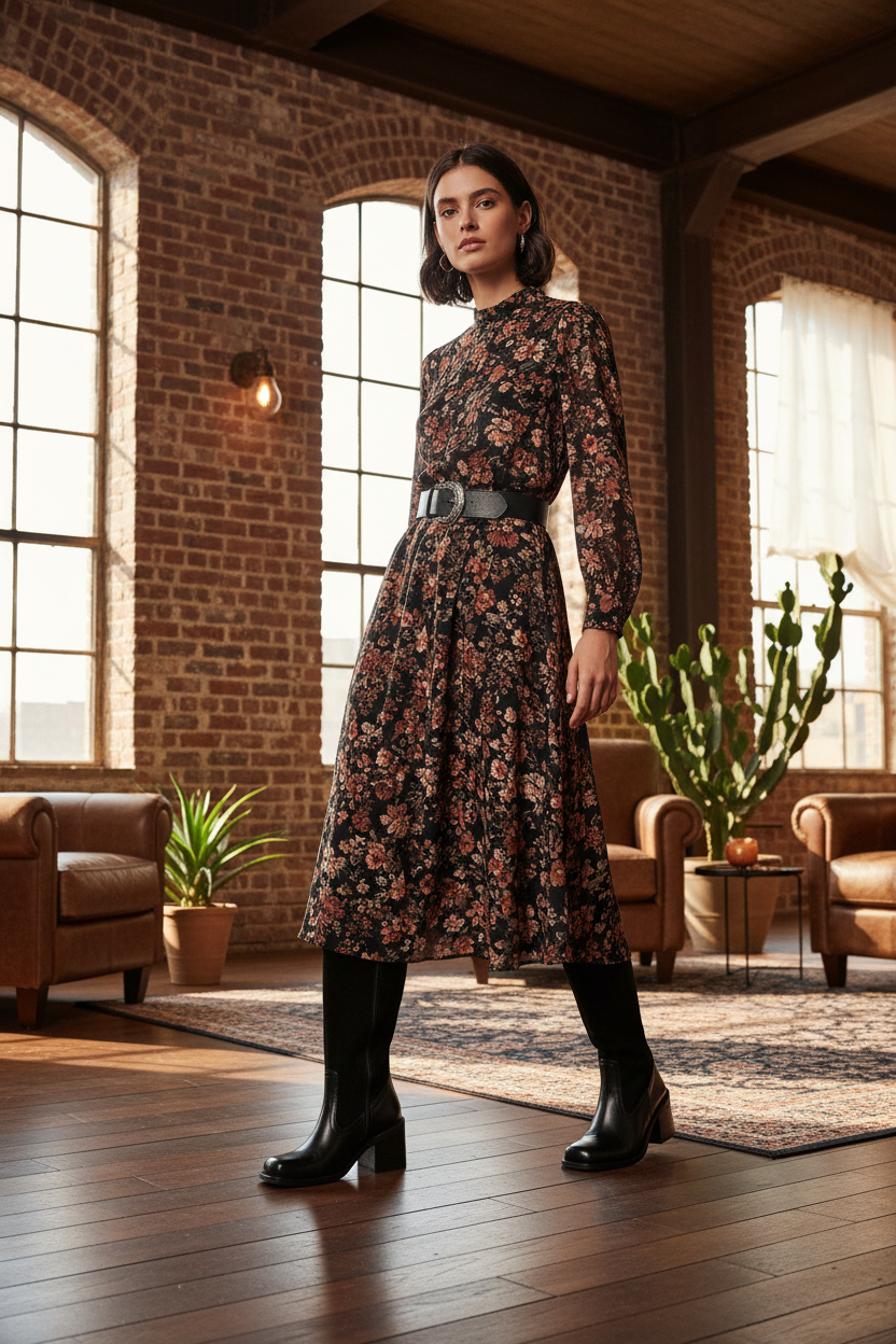 Bota de caña alta en una elegante combinación de cuero liso y gamuza negra, con punta Cuadrada y tacón ancho de altura media que proporciona estabilidad y estilo. Su diseño versátil es perfecto para looks casuales y semiformales, ideal para los días frescos y ocasiones especiales.