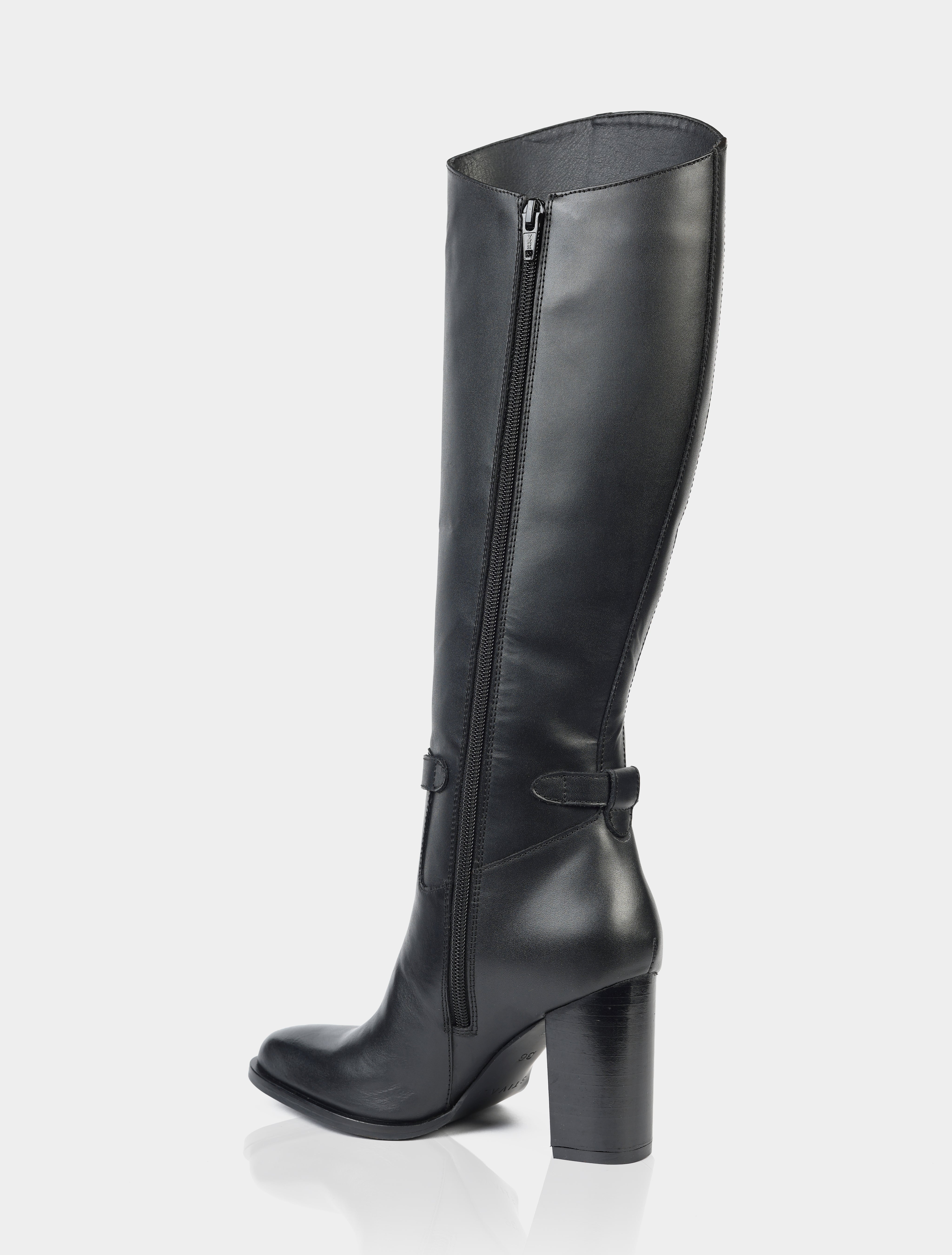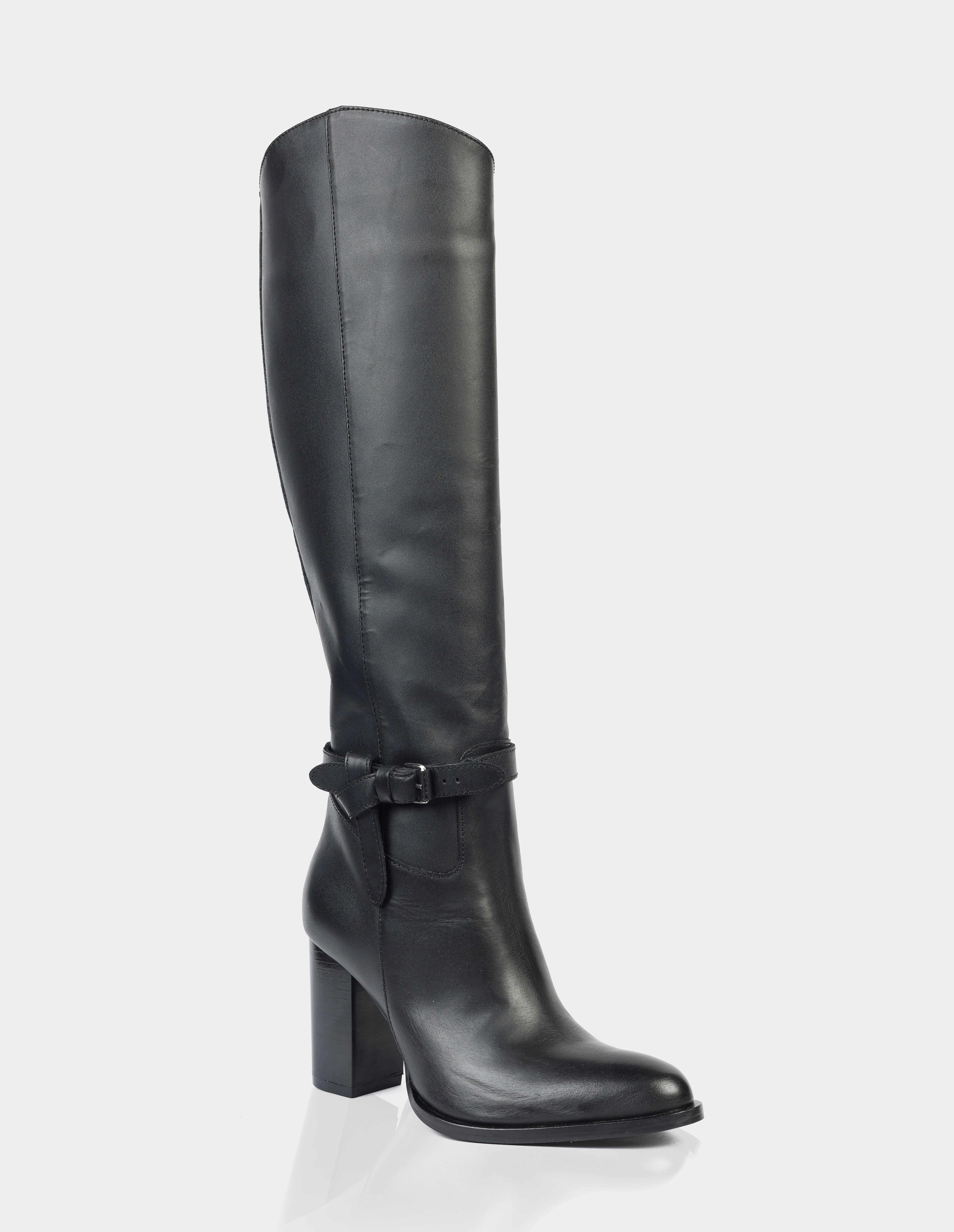 Su caña alta estiliza la pierna y garantiza un calce cómodo, mientras que el detalle de tira con hebilla lateral añade un toque sofisticado y de inspiración ecuestre. La punta suavemente redondeada ofrece comodidad en el uso diario, y el taco alto ancho brinda estabilidad y soporte, permitiendo llevarla durante largas jornadas sin perder estilo.