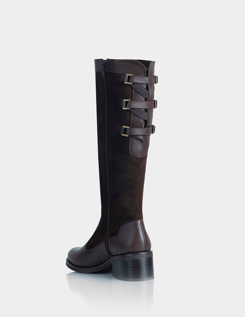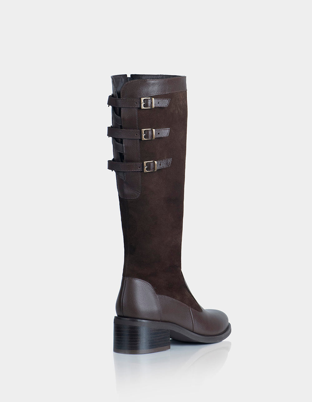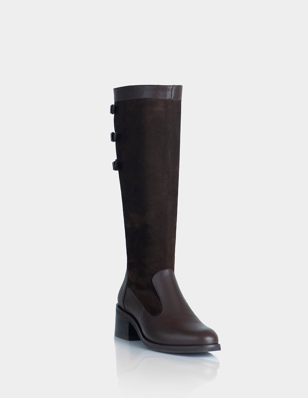 La Bota Urbe combina elegancia urbana con un diseño funcional y sofisticado. Su construcción mixta de cuero y gamuza, junto con detalles de hebillas laterales, la convierten en una opción refinada y versátil para el uso diario o para ocasiones especiales con un toque clásico.