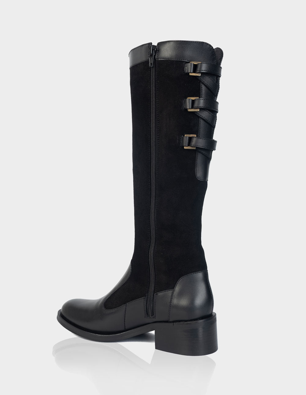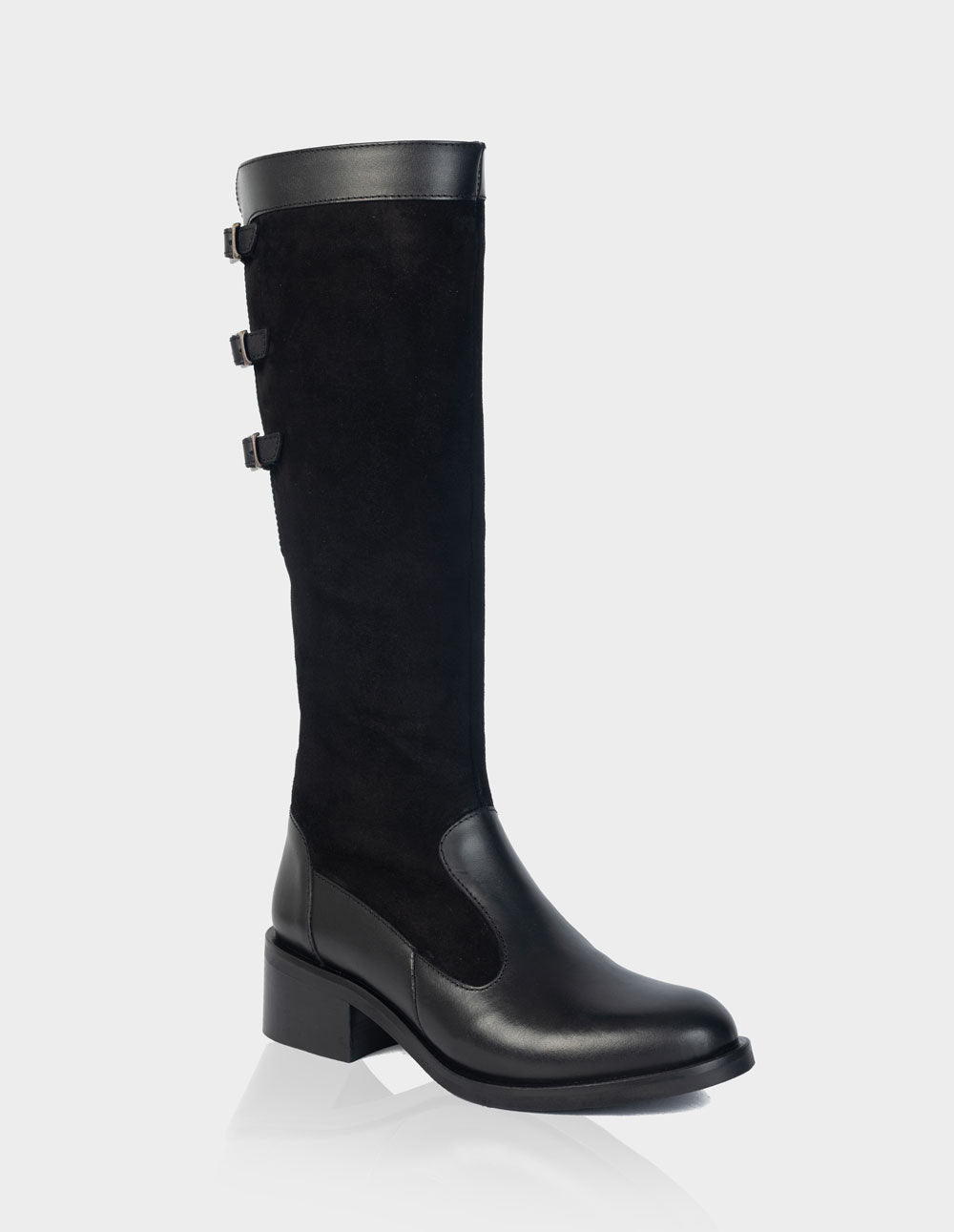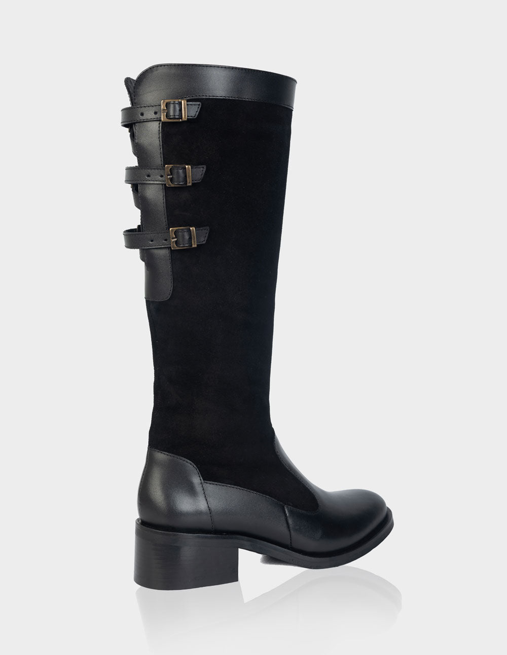 La Bota Urbe combina elegancia urbana con un diseño funcional y sofisticado. Su construcción mixta de cuero y gamuza, junto con detalles de hebillas laterales, la convierten en una opción refinada y versátil para el uso diario o para ocasiones especiales con un toque clásico.