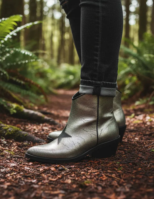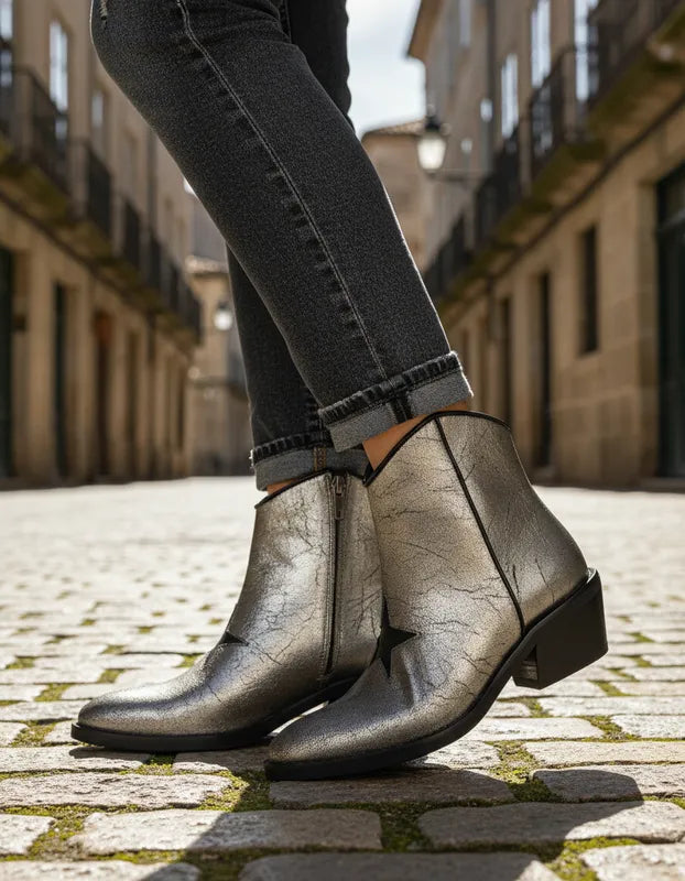 El Botín Andrómeda combina estilo western con un toque moderno. Hecho en cuero nacional de alta calidad, ofrece un diseño con punta semi afilada y tacón vaquero de 5 cm para comodidad y estabilidad. Cuenta con cierre lateral, forro textil y detalles únicos como una estrella decorativa. Disponible en bronce envejecido y plateado metálico, es ideal para looks casuales o con actitud. Perfecto para quienes buscan un calzado cómodo y con personalidad para cualquier ocasión.
