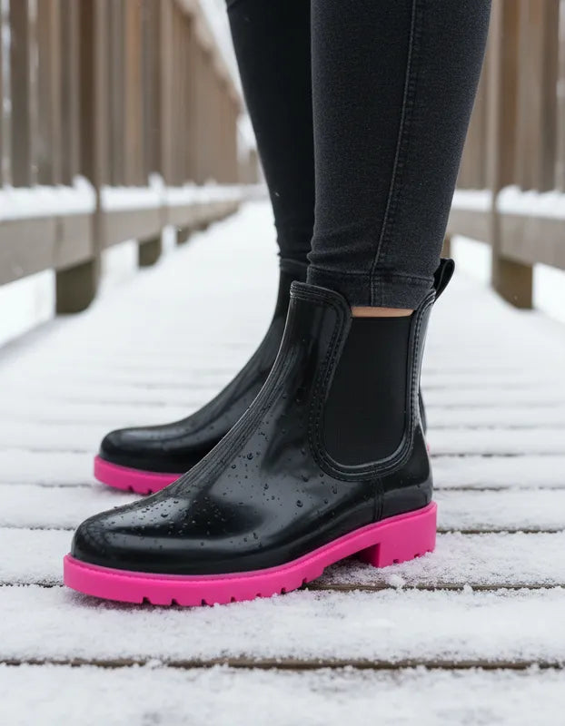 Este botín tipo Chelsea es una opción moderna y funcional para los días lluviosos. Fabricado en caucho de alta calidad, su diseño combina un acabado brillante en color negro con una suela gruesa en tono fucsia vibrante, aportando un toque de contraste y estilo único. Cuenta con paneles laterales elásticos que facilitan el calce y brindan comodidad, además de un tirador trasero para mayor practicidad. La suela con relieve antideslizante proporciona estabilidad en superficies húmedas, convirtiéndolo en una alternativa ideal para mantener los pies secos sin sacrificar el estilo.
