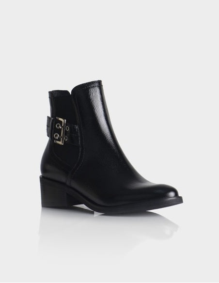 Este botín combina un diseño moderno y versátil, confeccionado en cuero negro brillante que aporta un acabado sofisticado. Su estilo elegante se destaca por una hebilla metálica lateral que añade un toque contemporáneo. La suela de goma y el tacón cuadrado de 3 cm garantizan confort y estabilidad, mientras que la punta ligeramente estilizada ofrece un aire refinado. Sin cierre, con laterales elásticos para facilitar el calce, es ideal para looks tanto casuales como formales, aportando un giro urbano y sofisticado a cualquier atuendo.