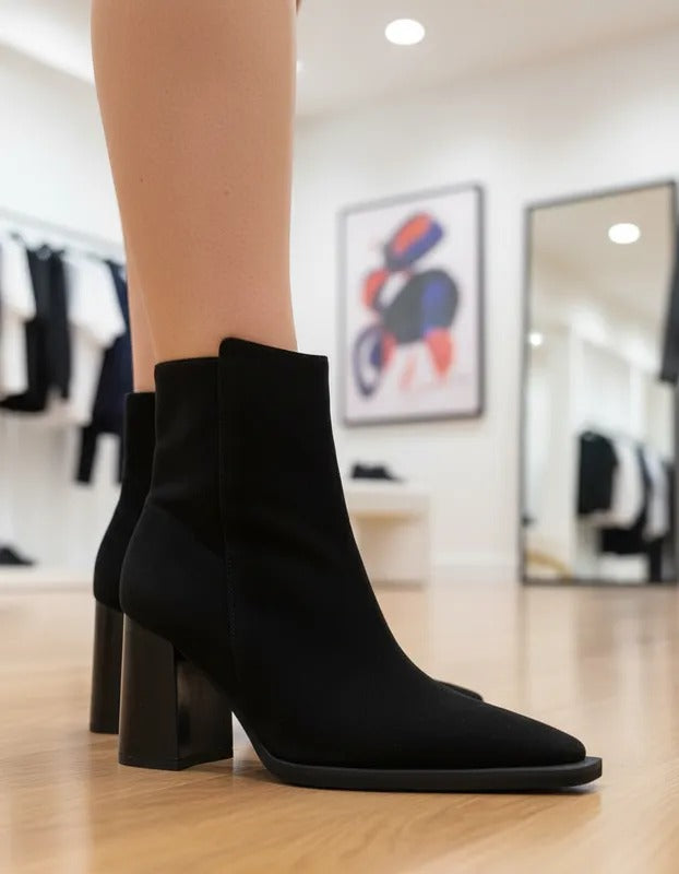 La caña al tobillo estiliza el pie y brinda un calce cómodo, mientras que la punta fina y definida suma un toque contemporáneo. El taco alto ancho ofrece estabilidad y confort, permitiendo usarlos durante todo el día o en ocasiones especiales sin perder comodidad.