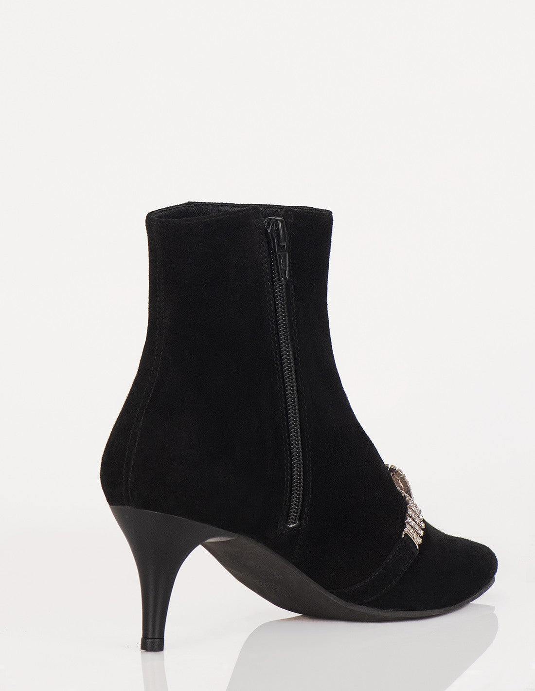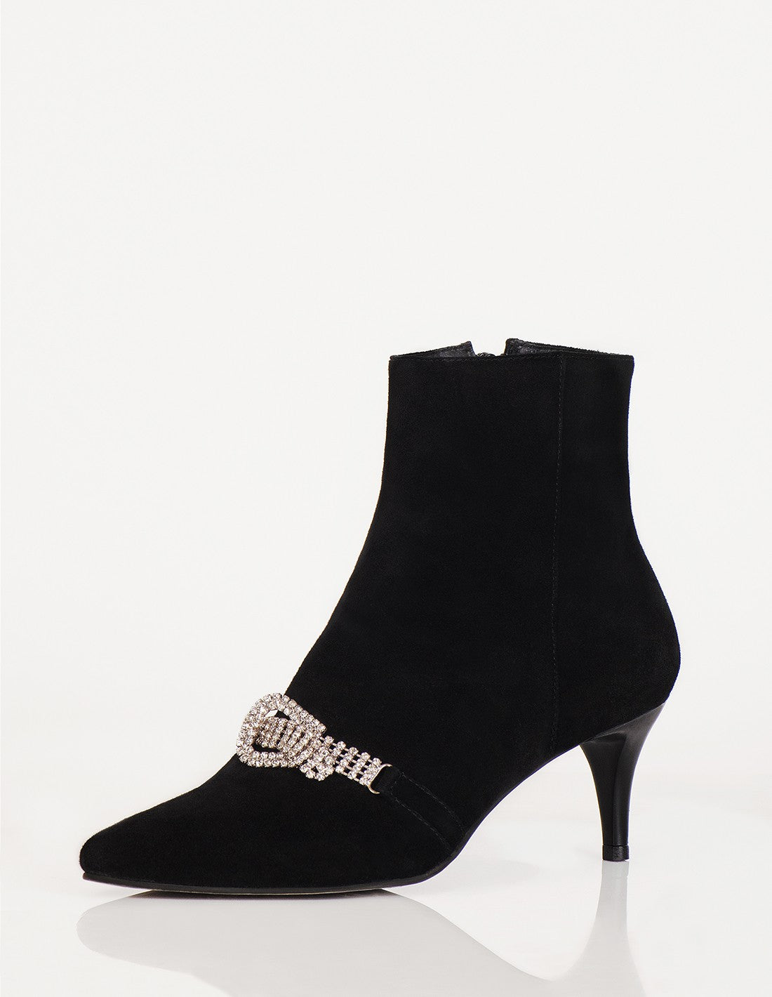 El Botín France es la elección perfecta para quienes buscan elegancia y distinción en un diseño versátil. Elaborado en 100% cuero ante de color negro, su textura suave y refinada se complementa con una silueta estilizada y punta fina que alarga visualmente la figura. El detalle de hebilla decorativa con incrustaciones brillantes aporta un toque de sofisticación y glamour, ideal para realzar cualquier look. Su tacón delgado y moderado proporciona una altura elegante sin sacrificar comodidad, convirtiéndolo en una opción ideal para ocasiones especiales o estilismos urbanos chic.