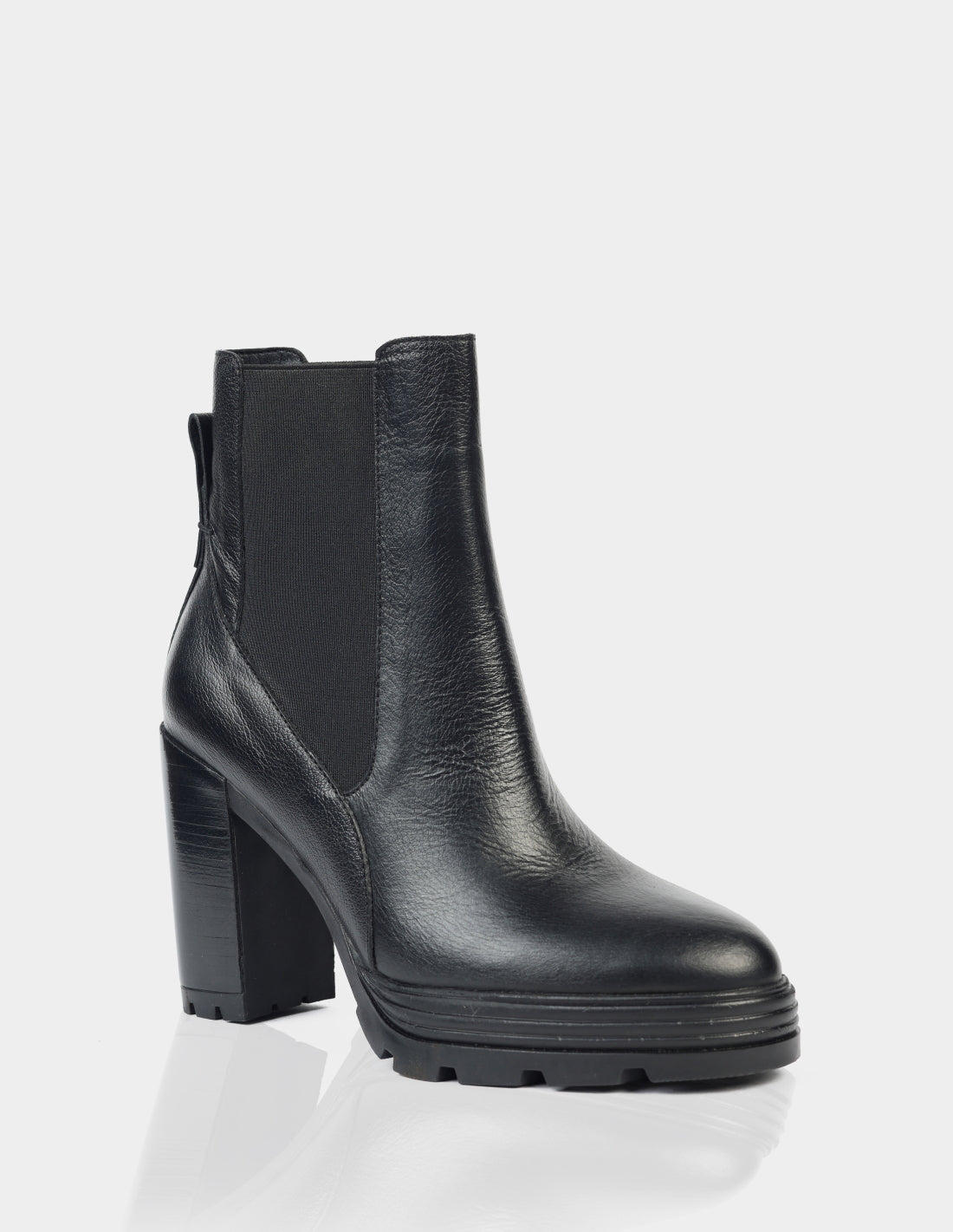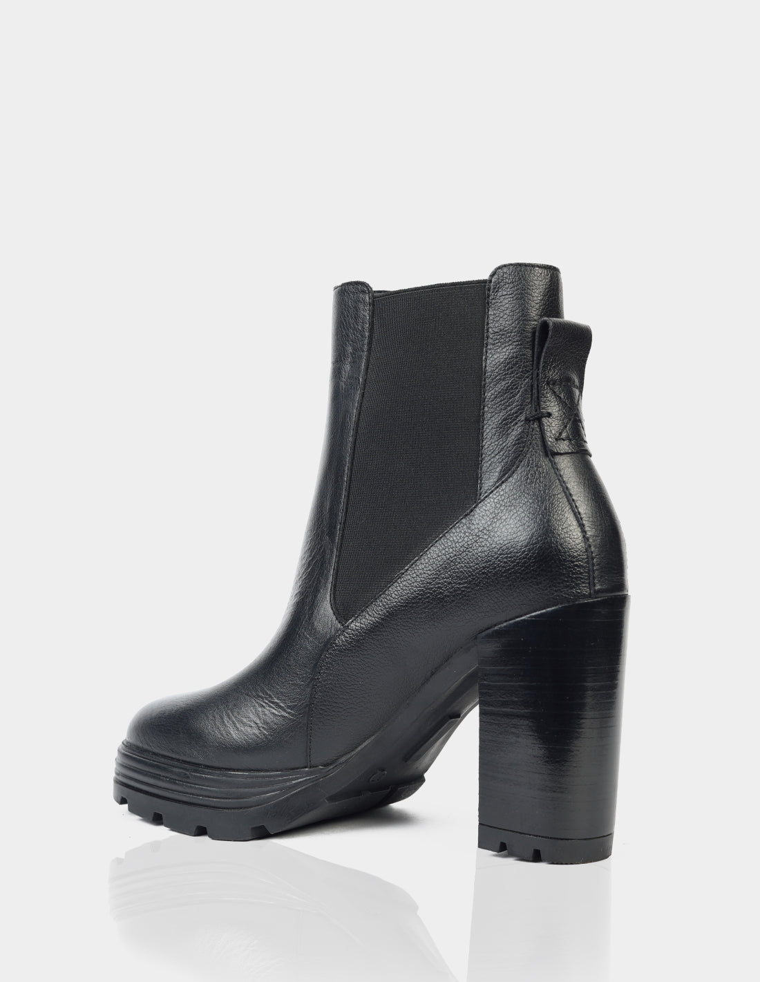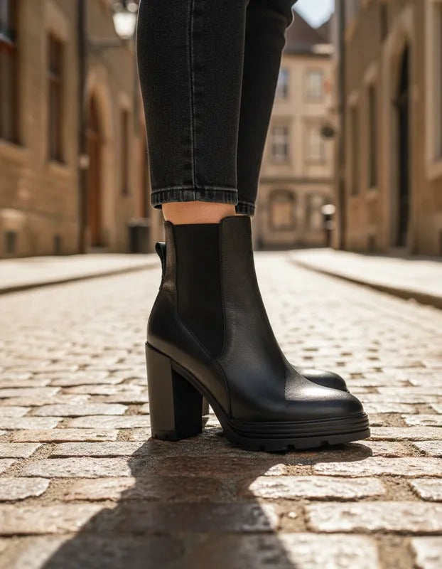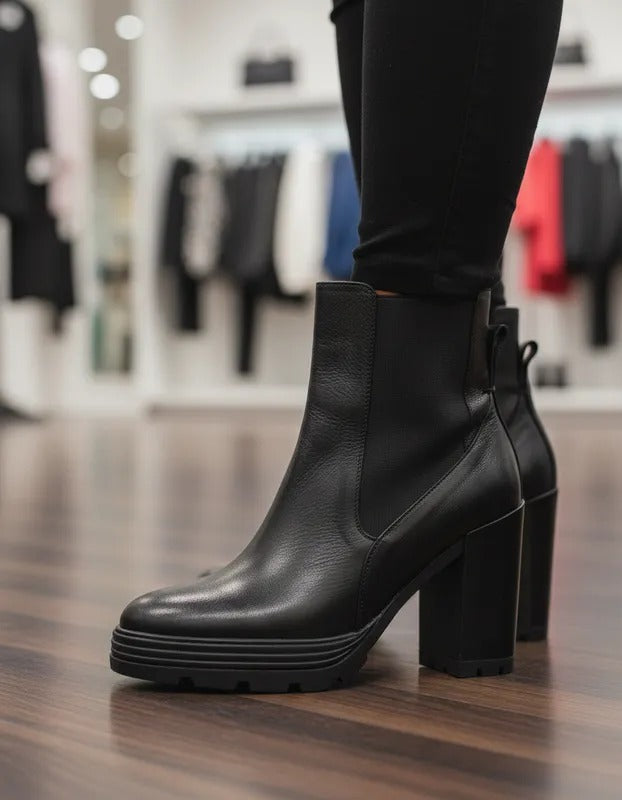 Su diseño tipo Chelsea incorpora paneles laterales elásticos que facilitan el calce y aportan comodidad durante todo el día. El tacón bloque alto, combinado con una plataforma delantera, ofrece una pisada estable y segura, estilizando la figura sin comprometer el confort. La suela dentada refuerza su impronta urbana y brinda mayor adherencia.