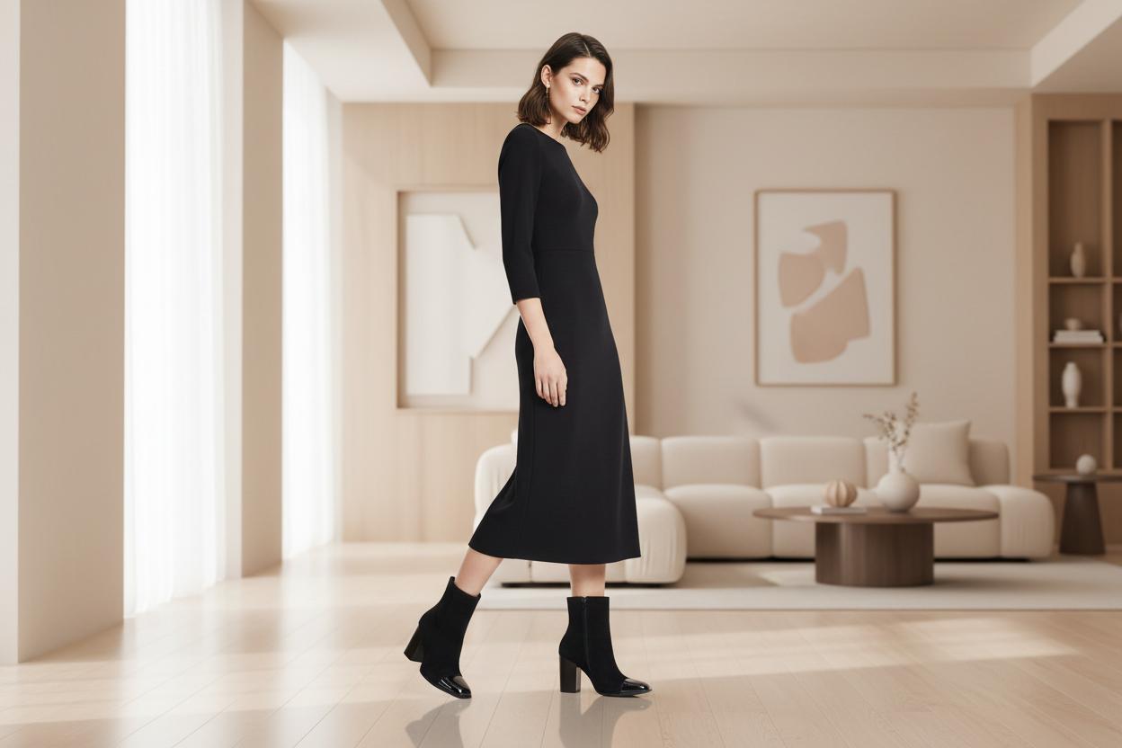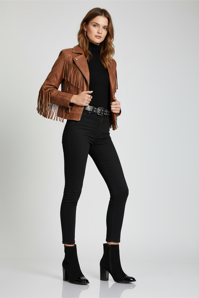 Este diseño combina materiales y texturas de manera armoniosa, perfecto para un look moderno y refinado. ¿Te gustaría más información o alguna sugerencia de estilo?