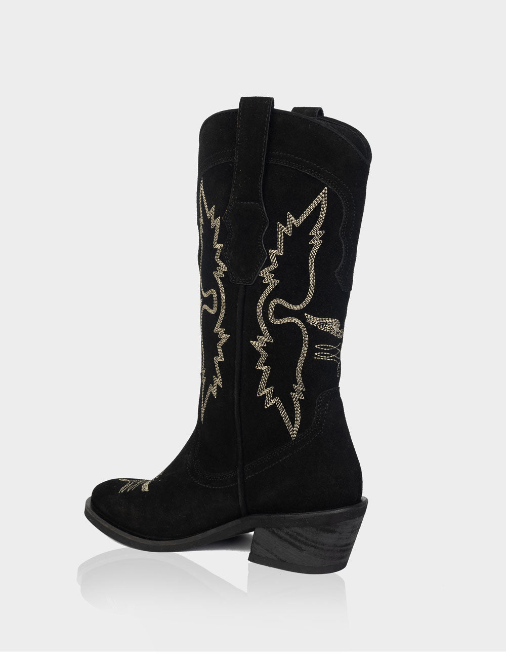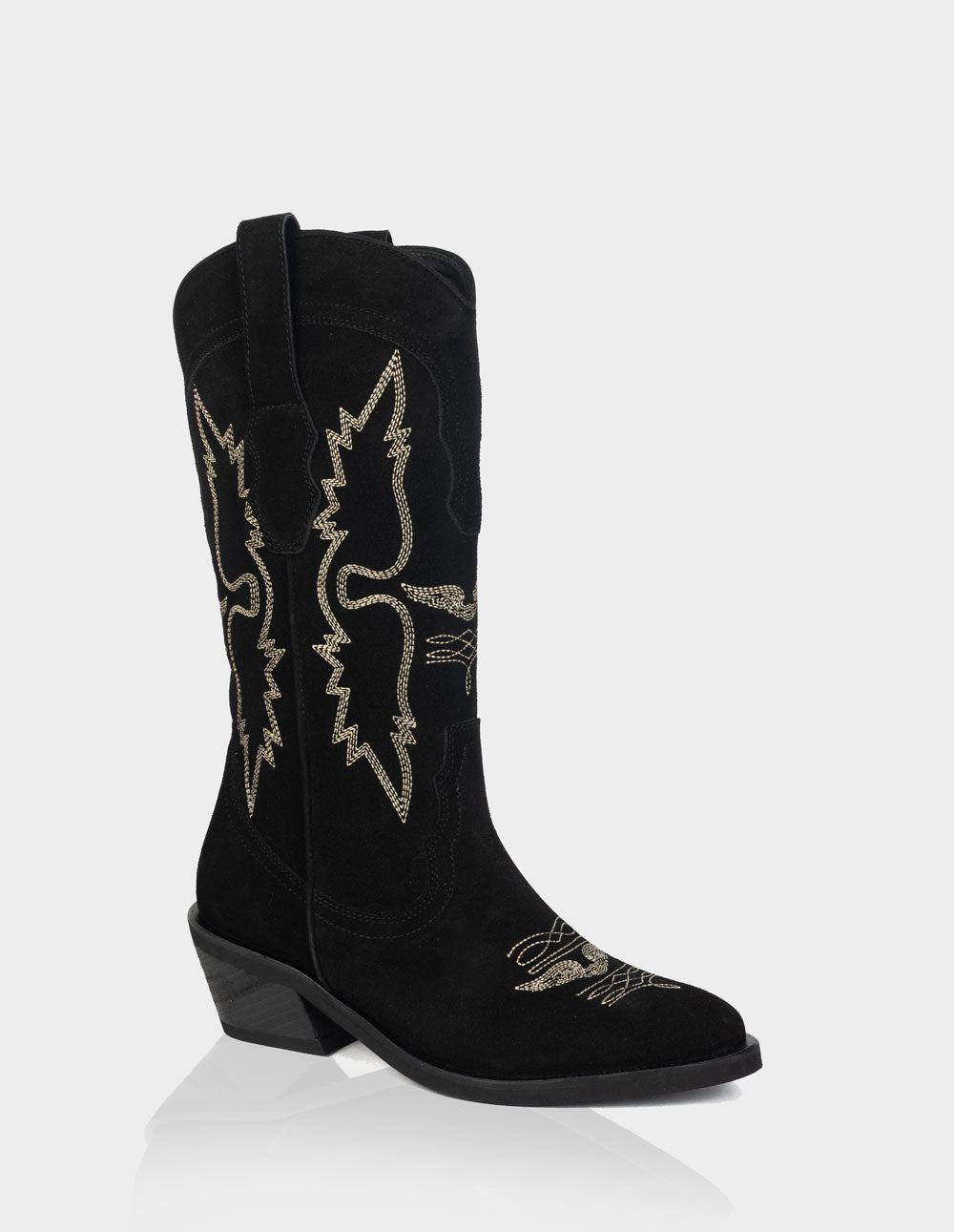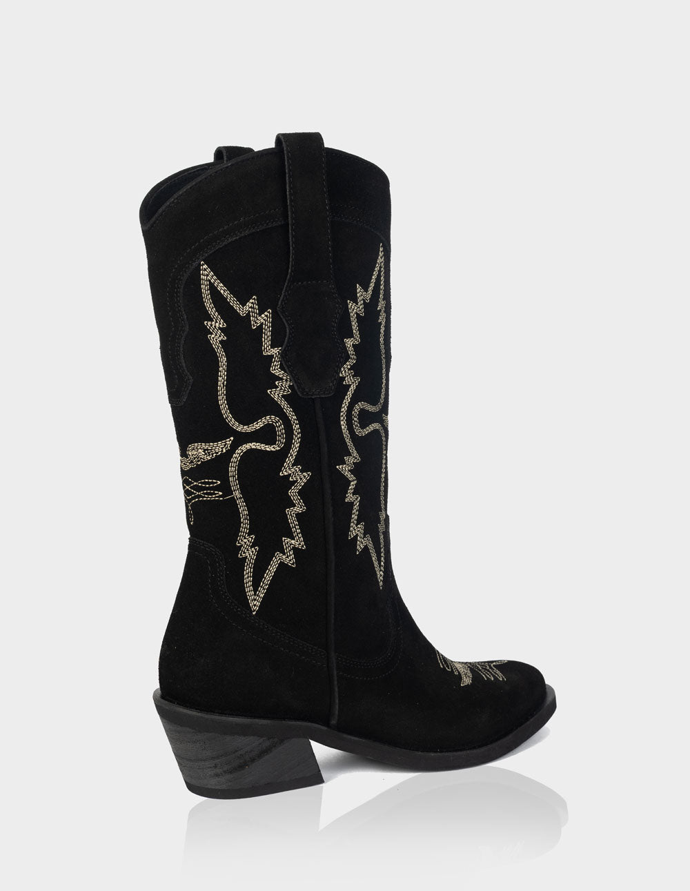 Haz una declaración de estilo con la Bota Alada, una pieza que combina la tradición western con un diseño moderno y femenino. Confeccionada en gamuza 100% natural, esta bota destaca por sus bordados decorativos inspirados en alas que aportan carácter y un aire distintivo.