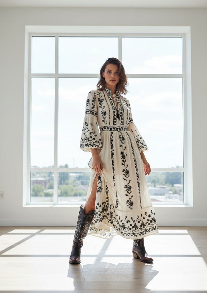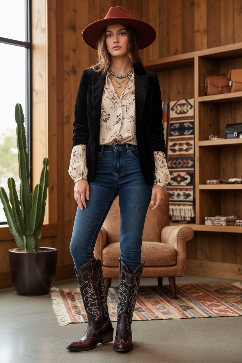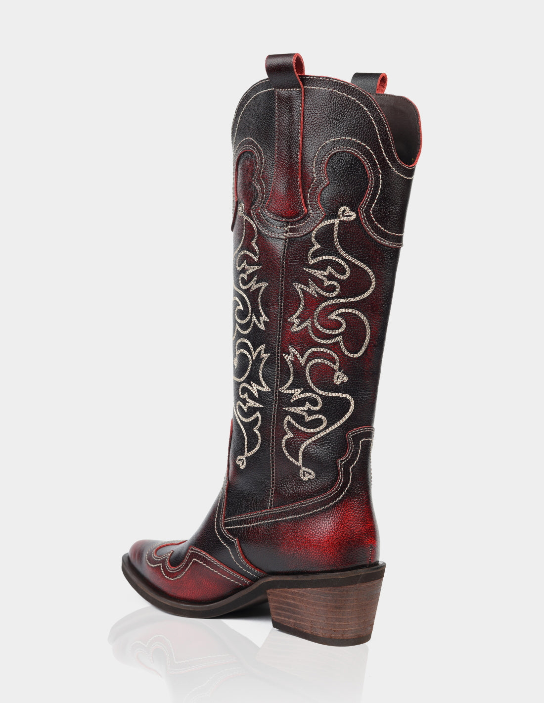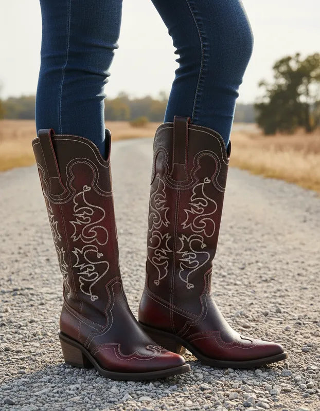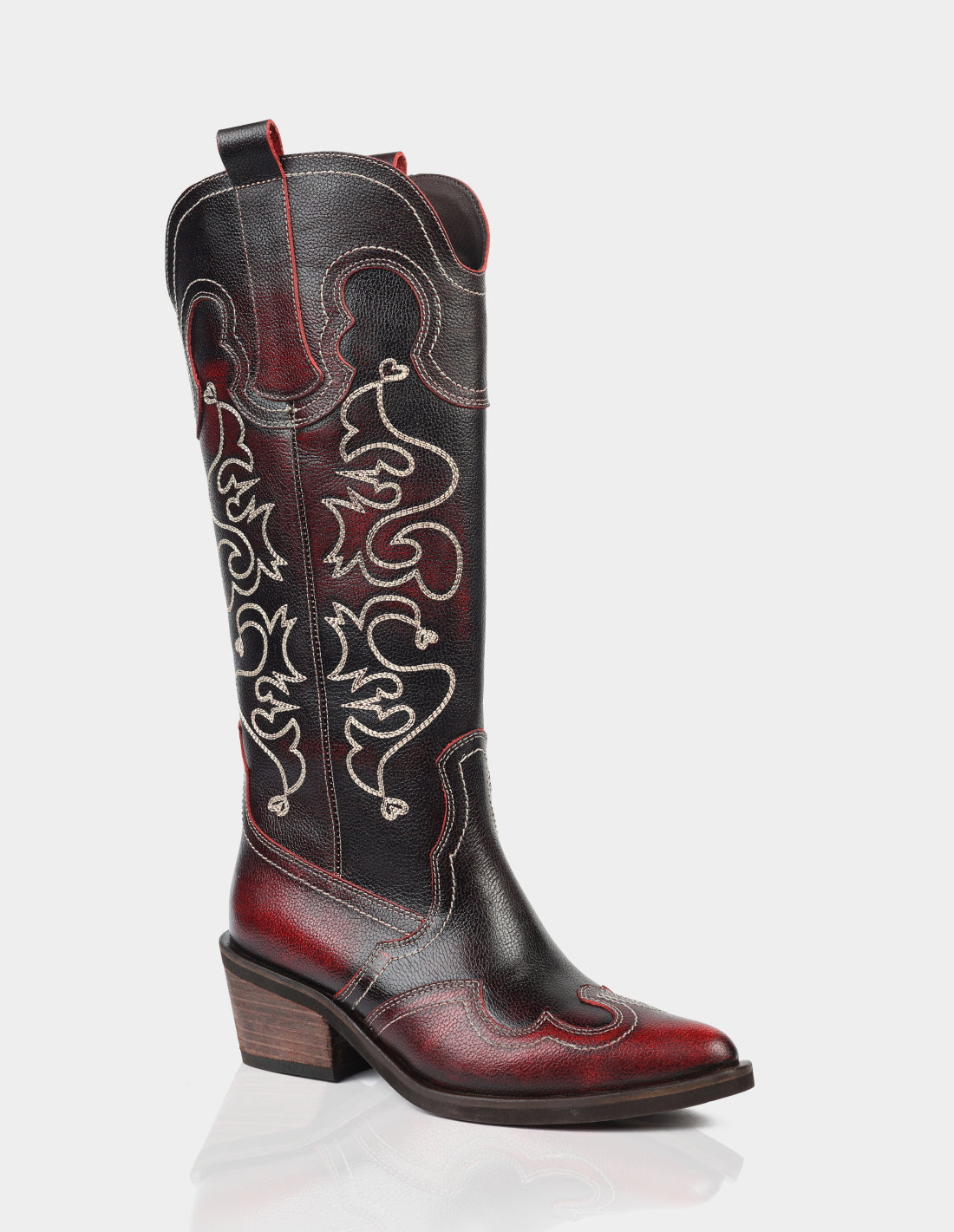 Bota de estilo western confeccionada en material tipo piel de alta calidad, disponible en tonos negro y vino. Presenta una caña alta con bordado decorativo en contraste, inspirado en el diseño clásico vaquero, que aporta carácter y personalidad al modelo. Su punta ligeramente afinada estiliza el pie, mientras que el tacón bajo y ancho proporciona estabilidad y confort para el uso prolongado. Incorpora tiradores laterales que facilitan el calce y una suela resistente, ideal tanto para uso urbano como para looks casuales con inspiración campestre. Un diseño versátil que combina tradición y modernidad, perfecto para destacar en cualquier temporada.