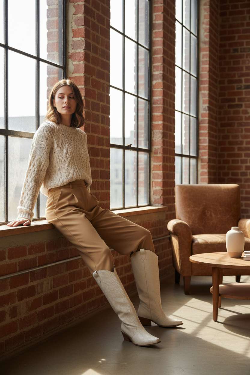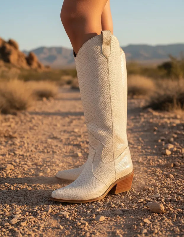 Texana Durango Croco Beige: bota de cuero croco con punta puntiaguda, tacón cuadrado de 5 cm y caña alta. Forro textil interior para comodidad y transpirabilidad. Diseño versátil que transiciona de casual a formal. Se adapta al pie con el uso. Requiere mantenimiento regular con productos específicos para cuero croco.