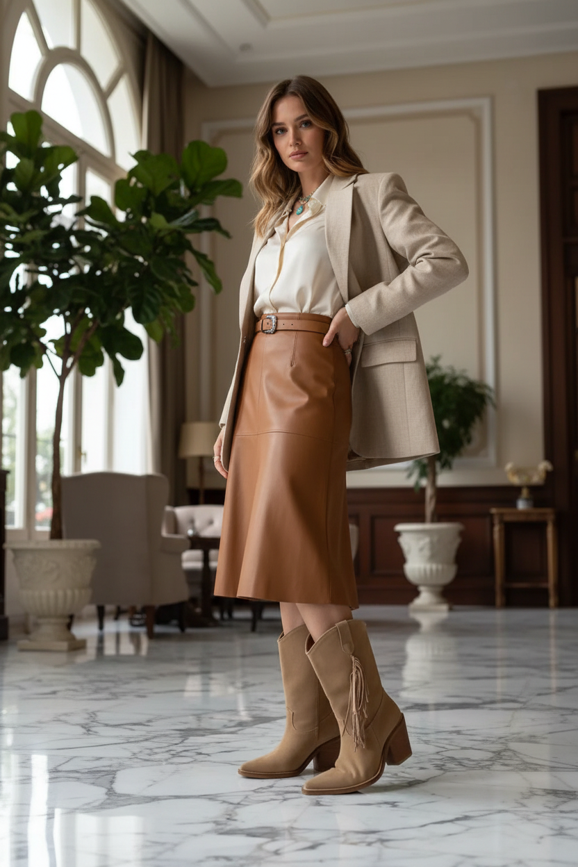 Inspiradas en el clásico diseño western, están elaboradas en cuero gamuzado tono arena y realzadas con flecos laterales que aportan movimiento y un toque bohemio inconfundible. Su tacón grueso de madera ofrece la altura justa con una pisada firme, ideal para elevar tus looks casuales o de tendencia.