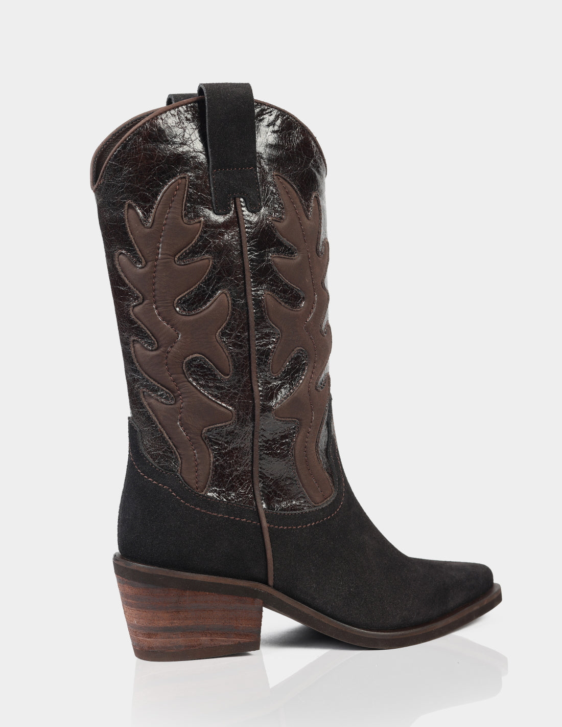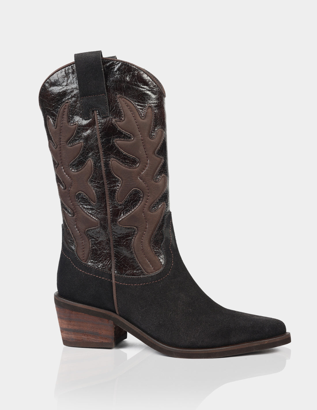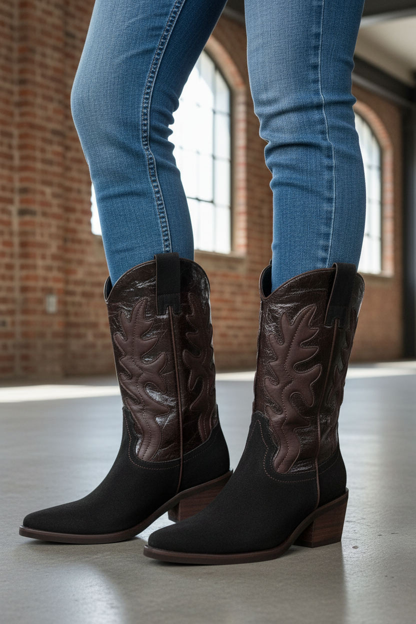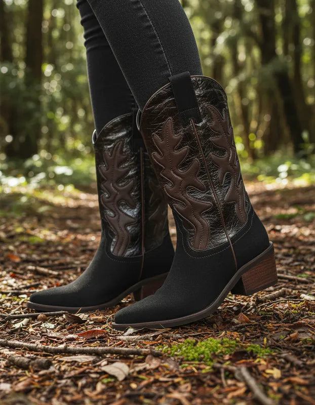 Las botas IRAZU reinventan el estilo western con un diseño sofisticado y completamente elaborado en 100% cuero . Combinan texturas en acabado gamuza y cuero brillante, creando un contraste elegante que resalta los detalles artesanales.