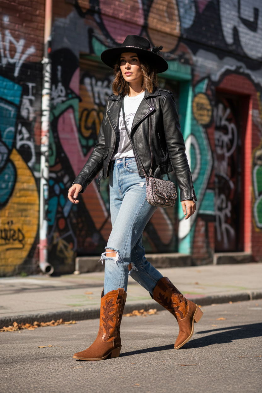 Su caña media presenta bordados y apliques inspirados en las clásicas botas vaqueras, mientras que la punta ligeramente afilada y el taco ancho aportan comodidad y estabilidad, ideales para usar todo el día sin perder estilo.