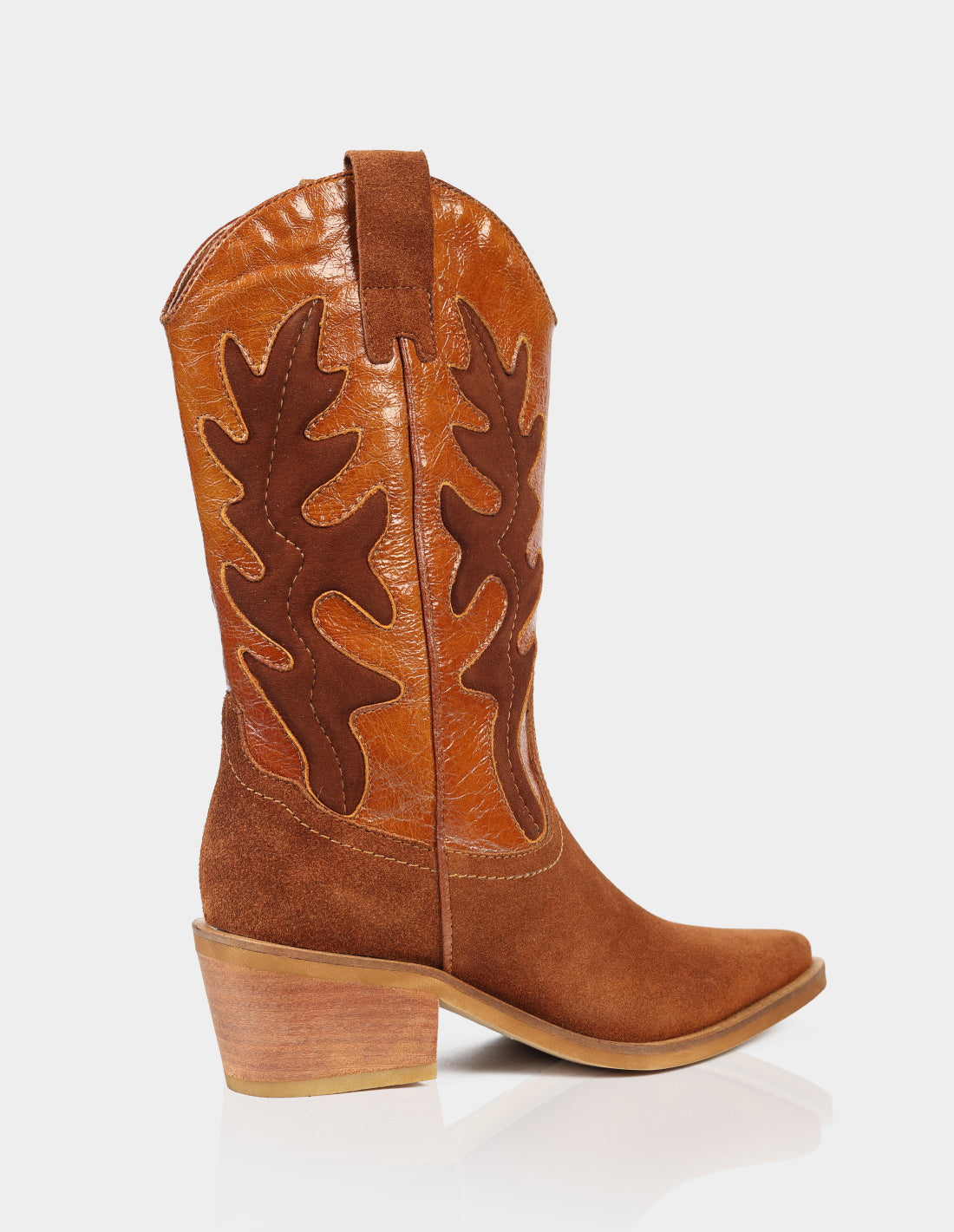 Las botas IRAZU reinventan el estilo western con un diseño sofisticado y completamente elaborado en 100% cuero . Combinan texturas en acabado gamuza y cuero brillante, creando un contraste elegante que resalta los detalles artesanales.