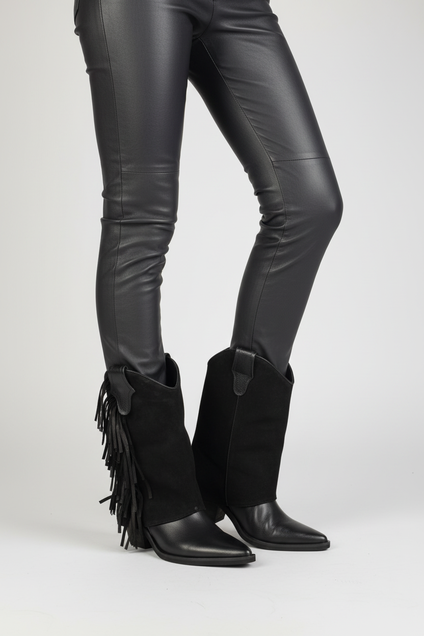 Estas botas de inspiración western destacan por su diseño versátil y funcional, confeccionadas en 100% cuero y pensadas para adaptarse a distintos estilos y ocasiones. Combinan una base en cuero liso color miel con una caña desmontable en gamuza, decorada con flecos laterales que aportan movimiento y un marcado carácter artesanal.