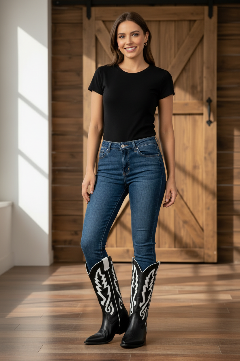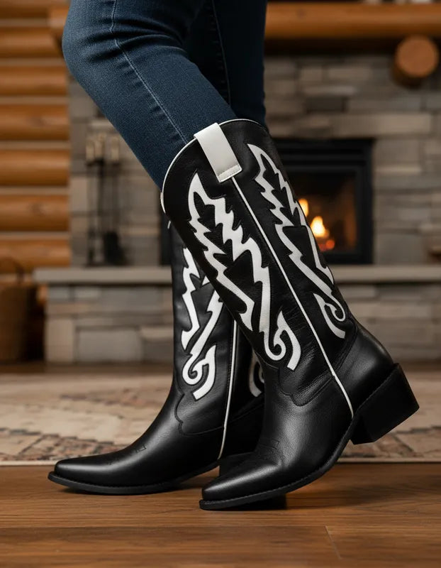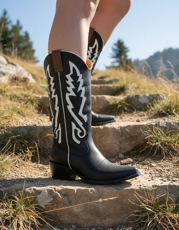 Bota texana Nashville en cuero nacional de primera calidad, con elegante contraste negro y blanco. Tacón de 4,5 cm que proporciona comodidad y estabilidad. Caña alta sin cierre con forro textil suave. Disponible en tallas 35 a 41 con horma normal. Detalles decorativos en relieve que añaden carácter al diseño clásico. Perfecta para quienes buscan autenticidad western con un toque contemporáneo.