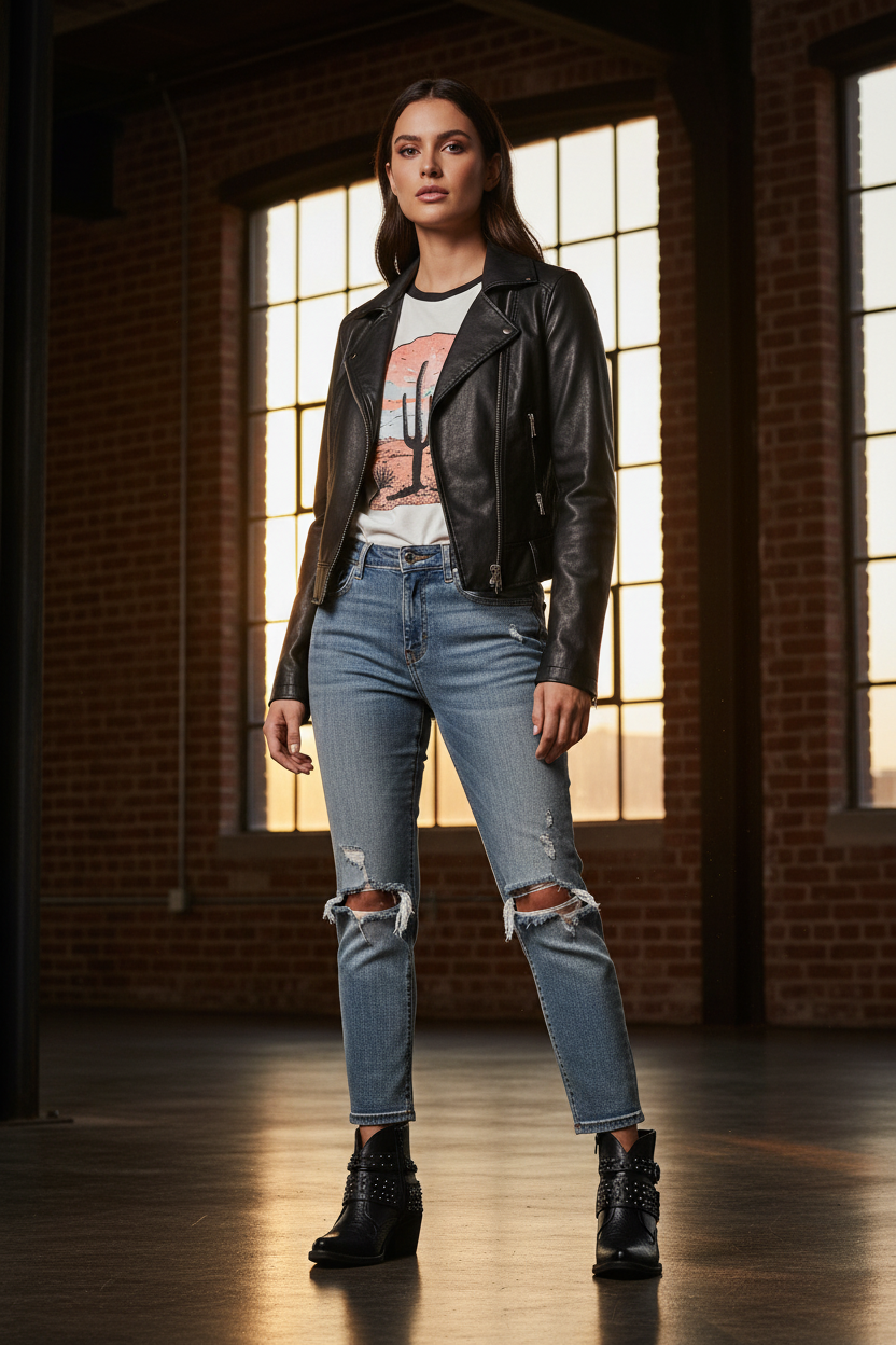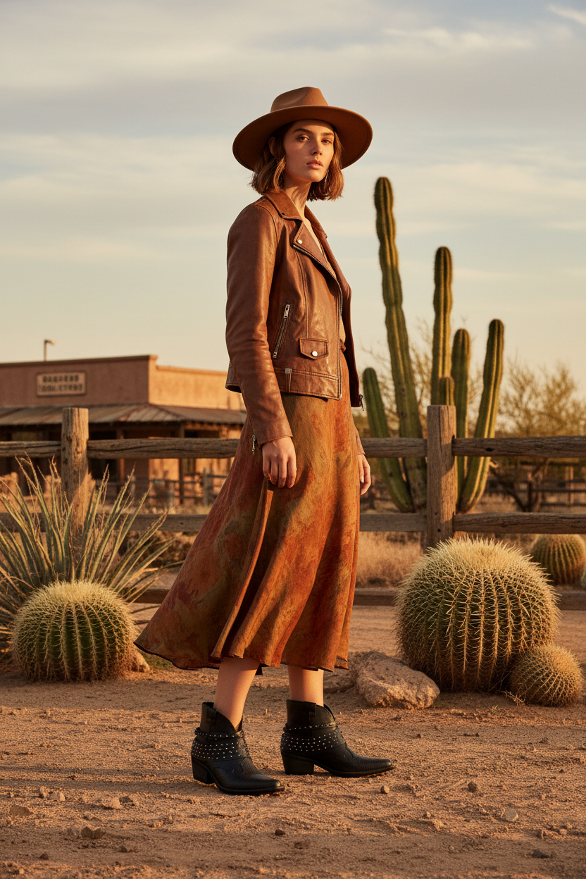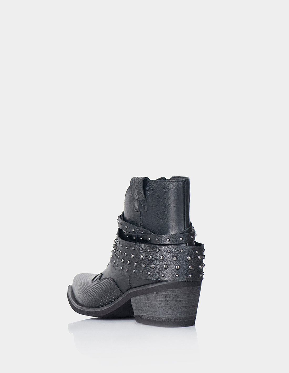 Este botín combina el espíritu cowboy con un toque contemporáneo y sofisticado. Fabricado en piel con textura tipo reptil, su diseño presenta una puntera afilada y un tacón medio de madera, ideales para estilizar la figura sin renunciar a la comodidad.