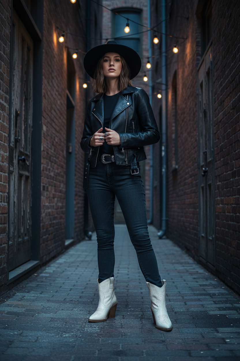 Botín estilo western en cuero craquelado beige, punta puntiaguda, tacón ancho de madera y detalles de bordado decorativo. Ideal para un look casual y moderno.