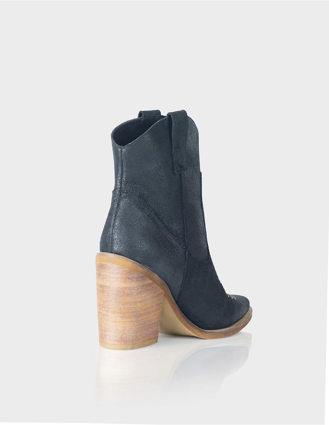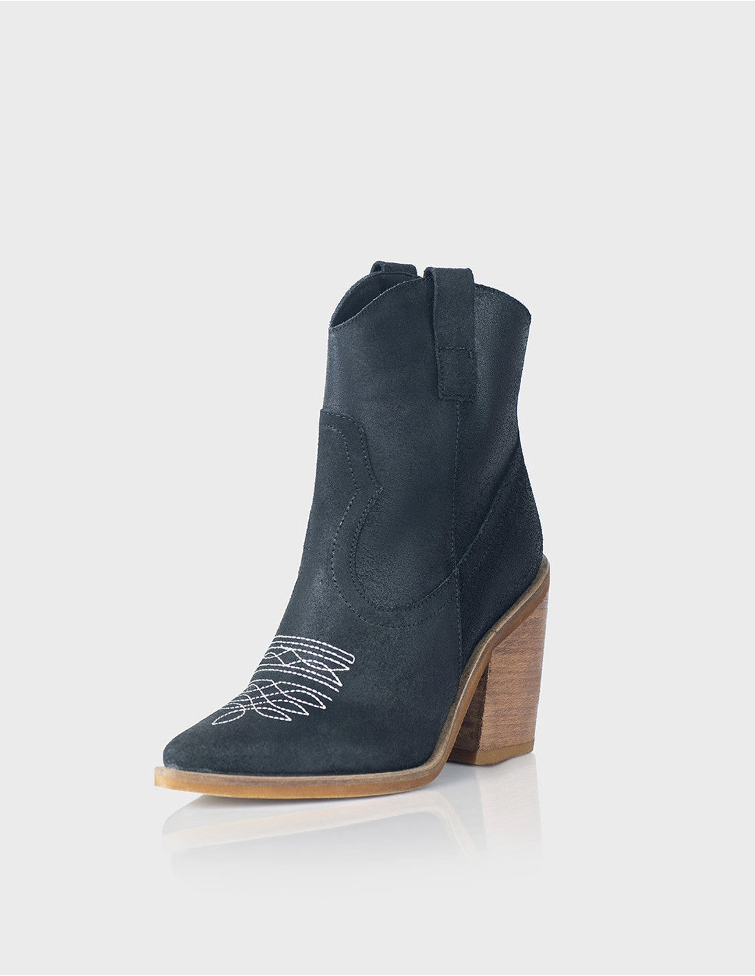 Botín estilo western en cuero craquelado beige, punta puntiaguda, tacón ancho de madera y detalles de bordado decorativo. Ideal para un look casual y moderno.